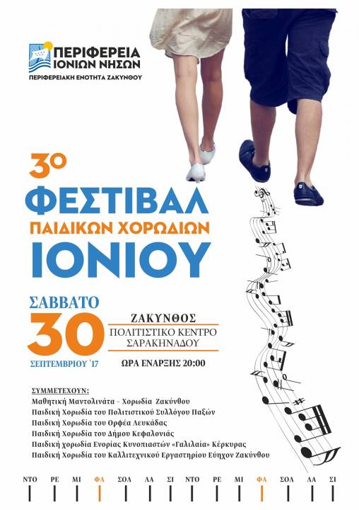 Η Περιφέρεια Ιονίων Νήσων διοργανώνει το 3ο Φεστιβάλ Παιδικών Χορωδιών Ιονίων Νήσων. Παιδικές χορωδίες από την Κέρκυρα, τους Παξούς, τη Λευκάδα, την Κεφαλονιά και τη Ζάκυνθο ενώνουν τις φωνές τους για να προσφέρουν ένα μοναδικό μουσικό βράδυ, το Σάββατο 30 Σεπτεμβρίου 2017 και ώρα 8μ.μ. στο Πολιτιστικό Κέντρο Σαρακηνάδου, στη Ζάκυνθο.