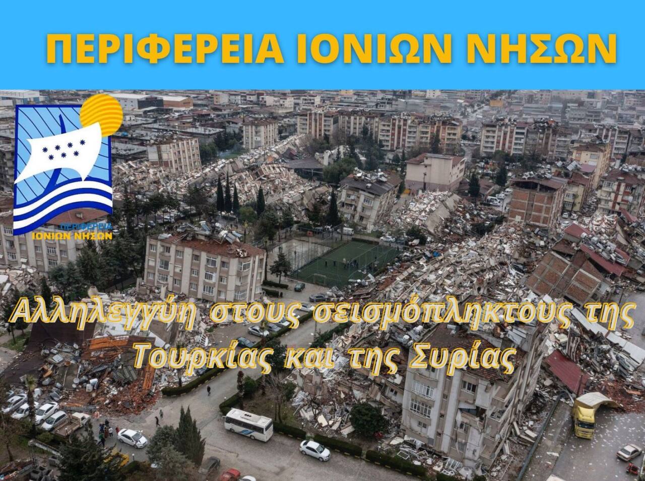 Η Περιφέρεια Ιονίων Νήσων εκφράζοντας τη συμπαράσταση της και την αλληλεγγύη της στη μεγάλη δοκιμασία που περνούν οι λαοί της Τουρκίας και της Συρίας ως αποτέλεσμα του μεγάλου σεισμού, συμμετέχει στην προσπάθεια ανθρωπιστικής βοήθειας.