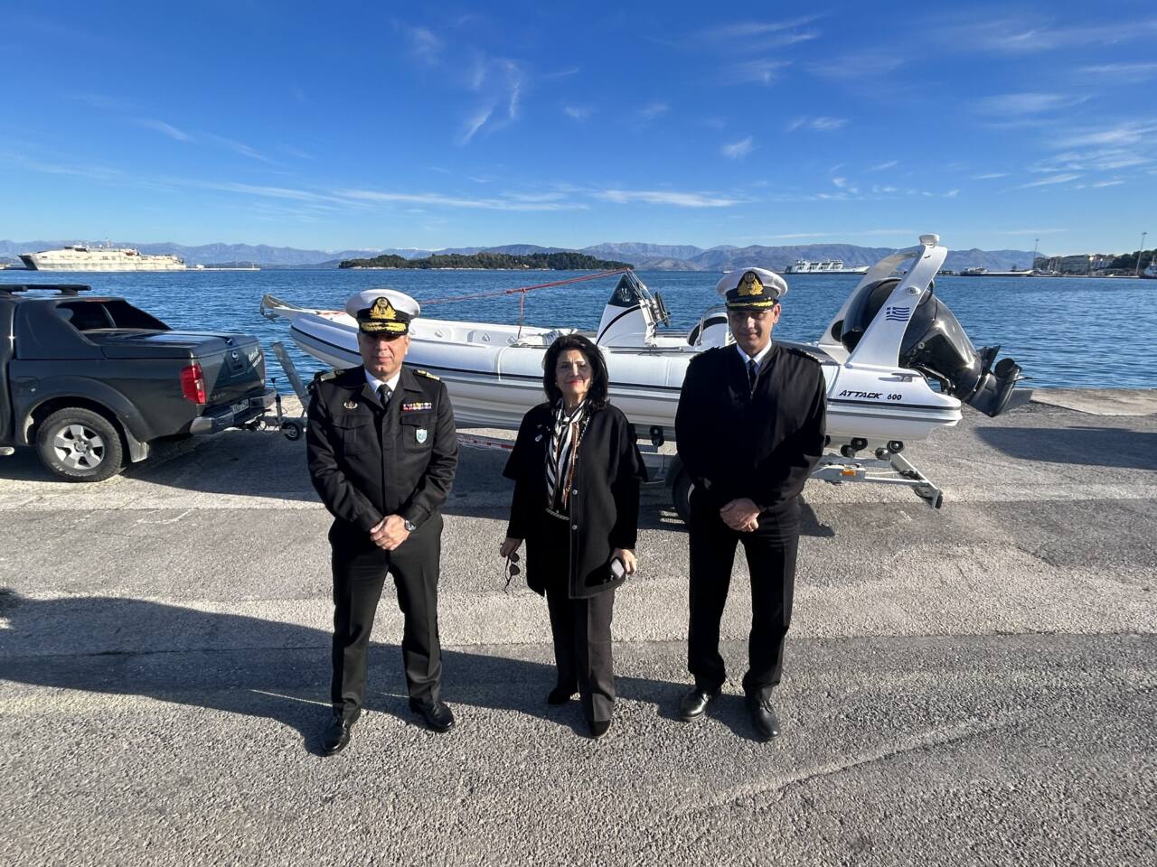 Η Περιφερειάρχης με την ευκαιρία παρουσίασε στους αξιωματικούς του Λιμενικού Σώματος το νέο σκάφος με εξωλέμβια μηχανή μήκους 6 μ και τρέιλερ μεταφοράς για την μεταφορά 8 ατόμων προσωπικού για παρακολούθηση προστατευόμενων περιοχών, κατολισθήσεων και διαβρώσεων ακτών, στα πλαίσια πρόληψης καθώς και αντιμετώπισης και διαχείρισης έκτακτων αναγκών. Η προμήθειά του έγινε μέσω του προγράμματος “AETHER – ALLIANCE FOR THE EFFECTIVE TRANSNATIONAL HANDLING OF ENVIRONMENTAL RESOURCES”, στα πλαίσια της Εδαφικής Συνεργασίας “Interreg V-A Greece – Italy 2014-2020”, στο οποίο η Περιφέρεια Ιονίων Νήσων συμμετείχε ως εταίρος.