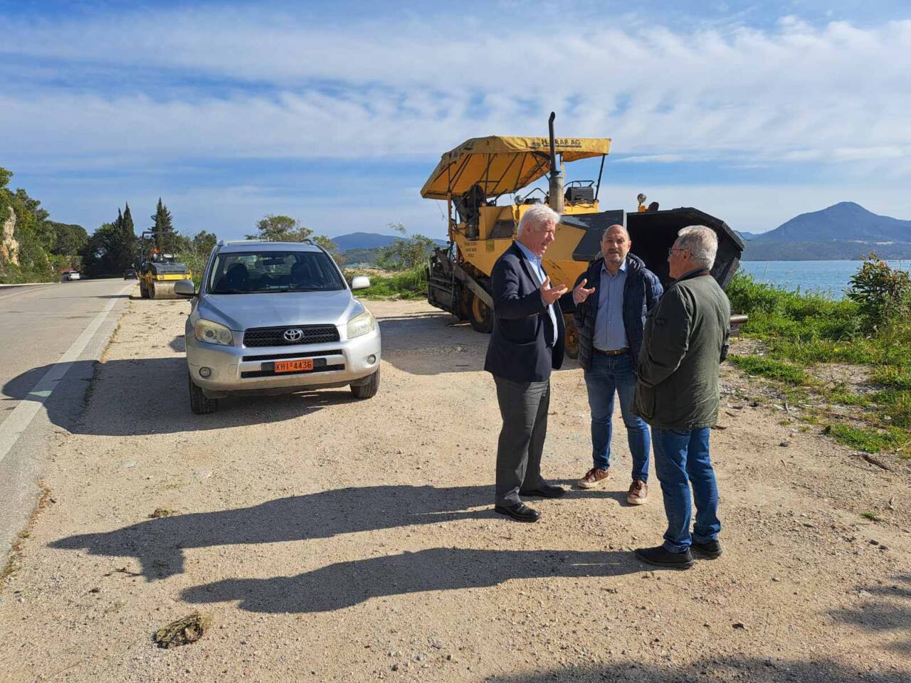 Στη συνέχεια βρέθηκε στην περιοχή του Επισκόπου που εκτελούνται εργασίες ασφαλτόστρωσης στο πλαίσιο του έργου «Αποκατάσταση Βατότητας Επαρχιακού Οδικού Δικτύου Π.Ε. Λευκάδας».