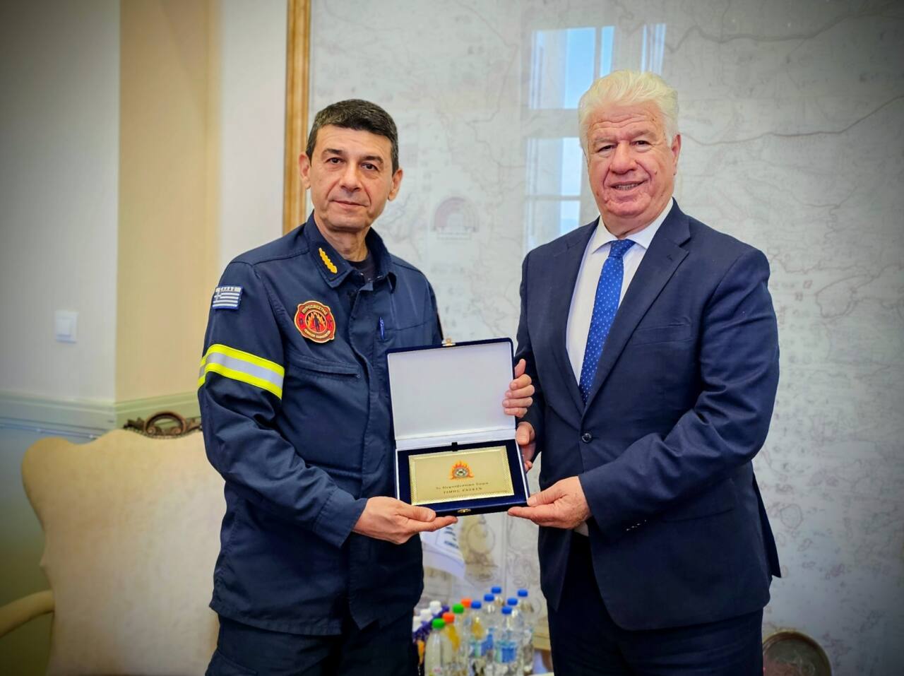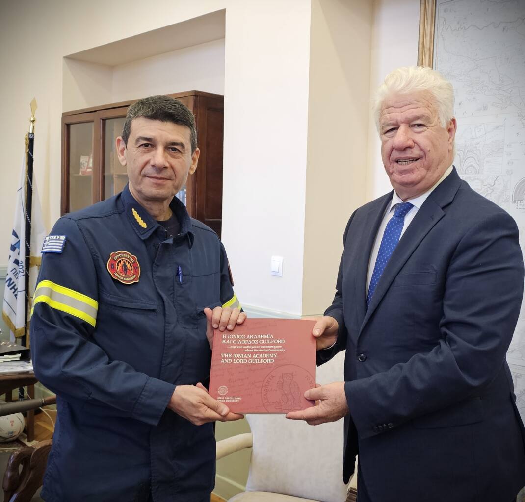 Στο τέλος της συνάντησης, ο Αντιστράτηγος επέδωσε στον Περιφερειάρχη αναμνηστική τιμητική πλακέτα, ως ένδειξη εκτίμησης για τη συνεργασία και τη στήριξη της Περιφέρειας στο έργο του Πυροσβεστικού Σώματος. Ο Γιάννης Τρεπεκλής ανταπέδωσε την τιμή, προσφέροντάς του τον κατάλογο της έκθεσης «Η Ιόνιος Ακαδημία και ο Λόρδος Guilford», αναδεικνύοντας τη διαχρονική πολιτιστική ταυτότητα των Ιονίων Νήσων.