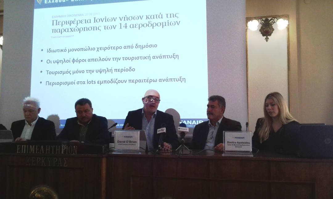 Στη συνέχεια ο Περιφερειάρχης Θ. Γαλιατσάτος συμμετείχε στην εκδήλωση – παρουσίαση των θέσεων της αεροπορικής εταιρείας Ryanair, από τον Εμπορικό Δ/ντη David O’ Brien, στο Επιμελητήριο Κέρκυρας, όπου και συζητήθηκε το θέμα της αγοράς των 14 αεροδρομίων από την κοινοπραξία της Fraport. Αξίζει να σημειωθεί ότι οι εκπρόσωποι της Ryanair κατέθεσαν την πλήρη αντίθεσή τους στο ενδεχόμενο δημιουργίας μονοπωλιακού καθεστώτος και την ιδιωτικοποίηση των αεροδρομίων, υπογραμμίζοντας ότι θα αποτελέσει εμπόδιο στην περαιτέρω ανάπτυξη και την οικονομία, ενώ επεσήμαναν και τον κίνδυνο αύξησης των τελών χρήσης.