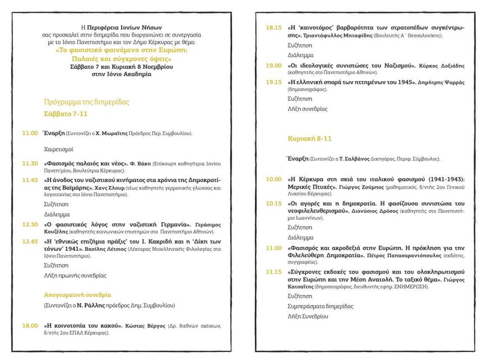 Η Περιφέρεια Ιονίων Νήσων σε συνεργασία με το Ιόνιο Πανεπιστήμιο, το Δήμο Κέρκυρας και το Δημοτικό Περιφερειακό Θέατρο Κέρκυρας (ΔΗ.ΠΕ.ΘΕ.Κ) διοργανώνει, με αφορμή την πρώτη μαθητική αντιφασιστική διαδήλωση στην Ευρώπη, στις 2 Νοεμβρίου (Πρωτοκύριακο) 1941 στην Κέρκυρα, διήμερο εκδηλώσεων με θέμα το φασιστικό φαινόμενο.