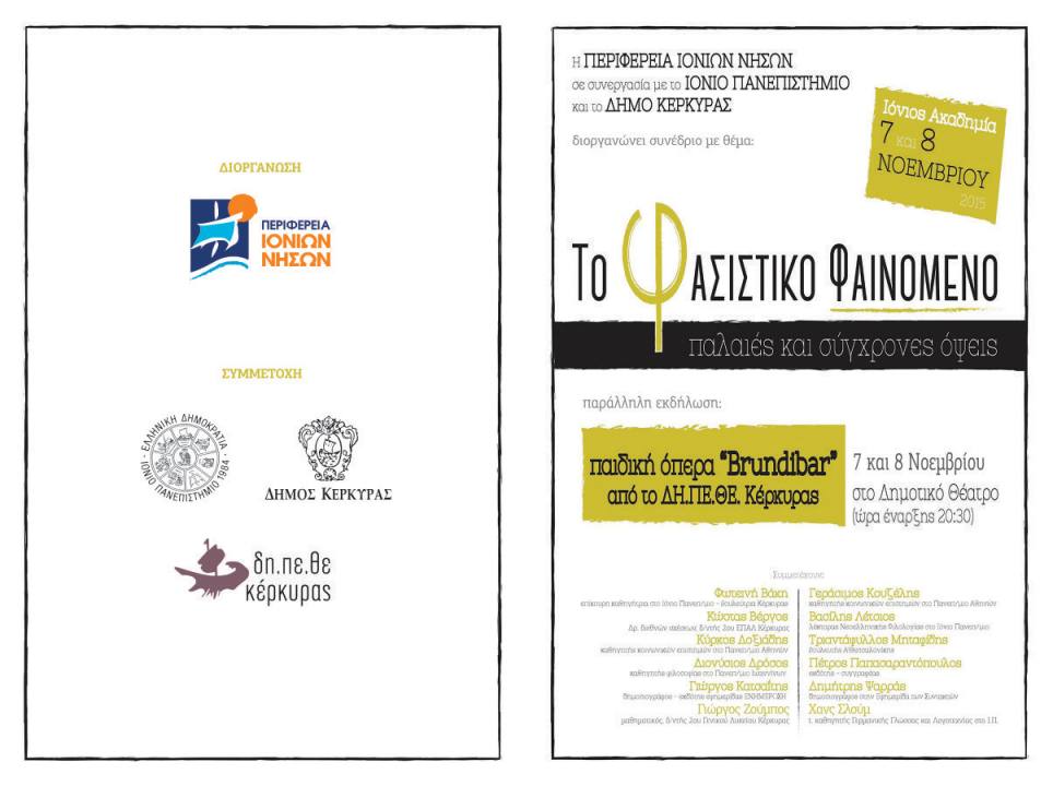 α) Συνέδριο με θέμα : «Το φασιστικό φαινόμενο στην Ευρώπη: Παλαιές και σύγχρονες όψεις» το Σάββατο 7 και Κυριακή 8 Νοεμβρίου στην Ιόνιο Ακαδημία.