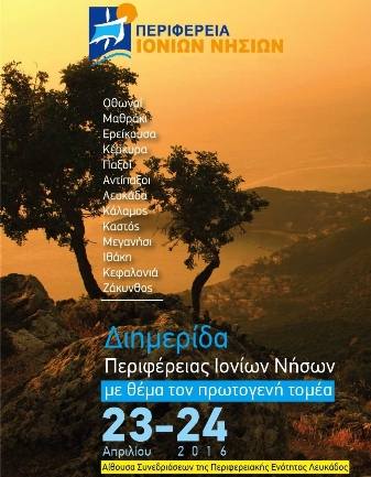 Η Περιφέρεια Ιονίων Νήσων και το Περιφερειακό Ταμείο Ανάπτυξης Ιονίων Νήσων διοργανώνουν διημερίδα, το Σάββατο 23 και την Κυριακή 24 Απριλίου 2016, στη Λευκάδα, με θέμα «Παρουσίαση των Στρατηγικών Ανάπτυξης την Π.Ι.Ν για τον πρωτογενή τομέα Ευκαιρίες επέκτασης της αγοράς για τα προϊόντα της Ιόνιας Γης».