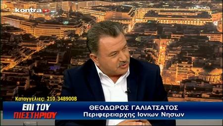 Ο Περιφερειάρχης Ιονίων Νήσων Θεόδωρος Γαλιατσάτος προσκεκλημένος στο Kontra Tv και την εκπομπή του Σωτήρη Ξενάκη με σχολιαστή τον Μάκη Κουρή, ερωτώμενος για τους νέους συντελεστές ΦΠΑ στα νησιά απάντησε: